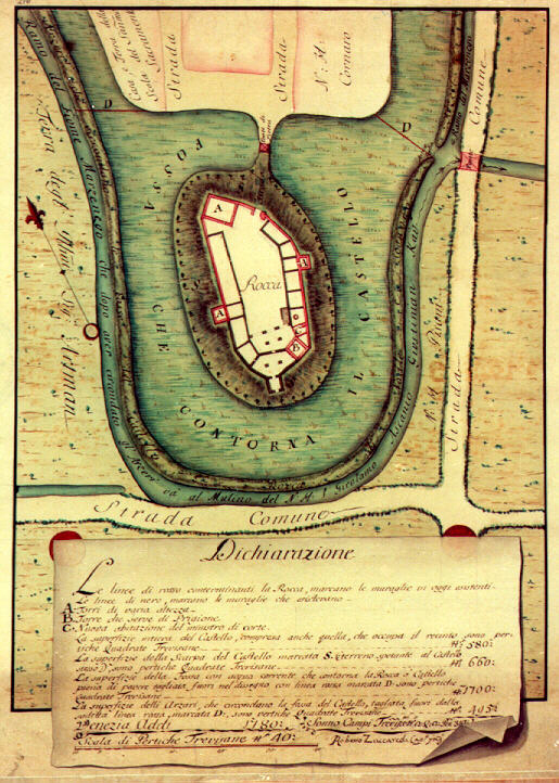 In rosso sono indicati i corpi di fabbrica ancora esistenti mentre la parte già demolita è segnata in nero.