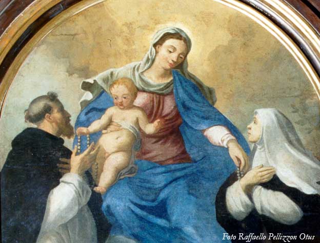 La parte alta del dipinto ricorda il dono del rosario da parte della Madonna a san Domenico di Guzman (1210) e porge il rosario a santa Caterina da Siena, autorevole esponente femminile dell'ordine Domenicano.